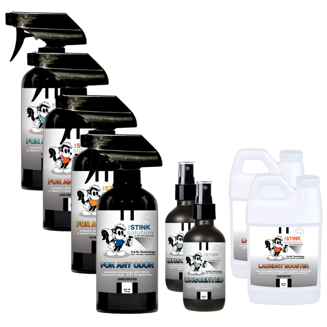 Buy 4 Get Super Sample Bundle FREE - 1 Unscented (16 oz), 1 Citrus Orange (16 oz), 1 Coconut Mango (16 oz), 1 Tranquility (16 oz), 2 Unscented (4 oz), + 2 Unscented Mini Laundry Boosters | Odor Eliminating Spray