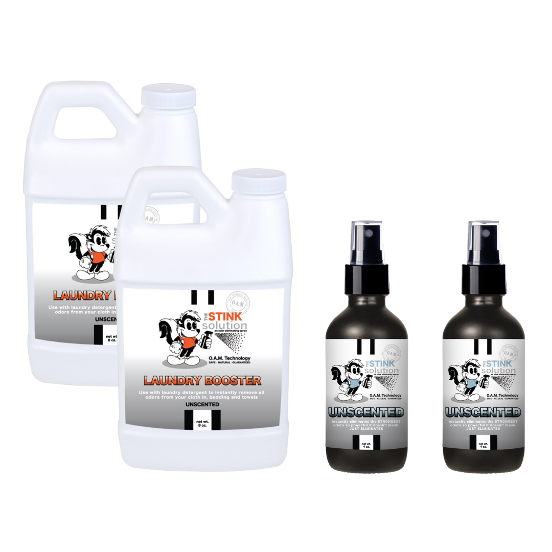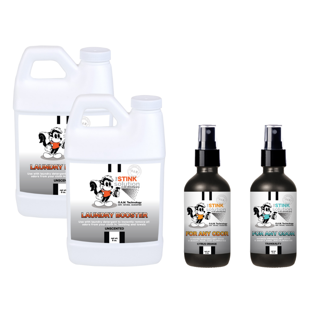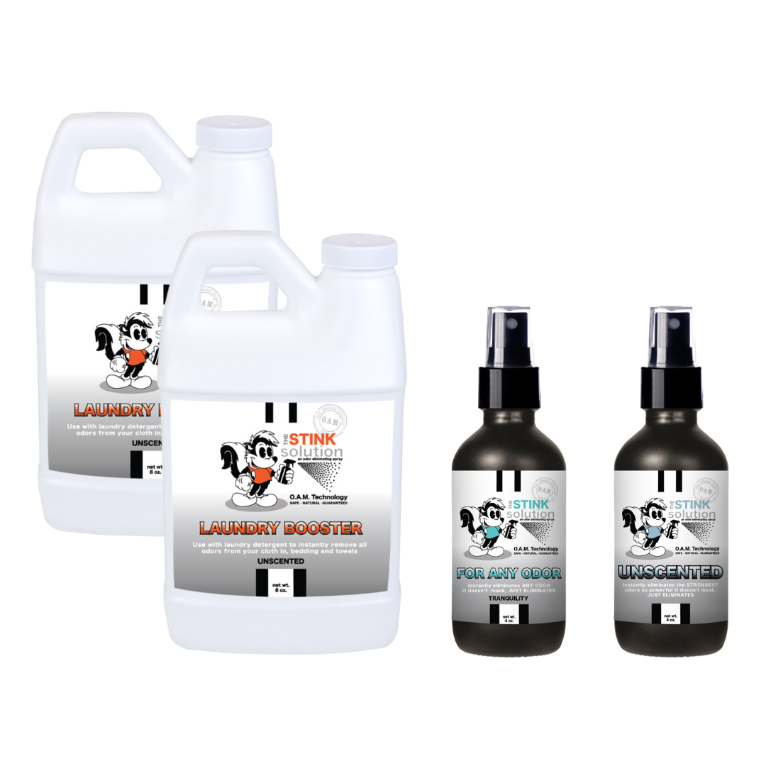 Super Sample Bundle - Two Unscented Mini Laundry Boosters + Two 4 oz For Any Odor Eliminator Sprays